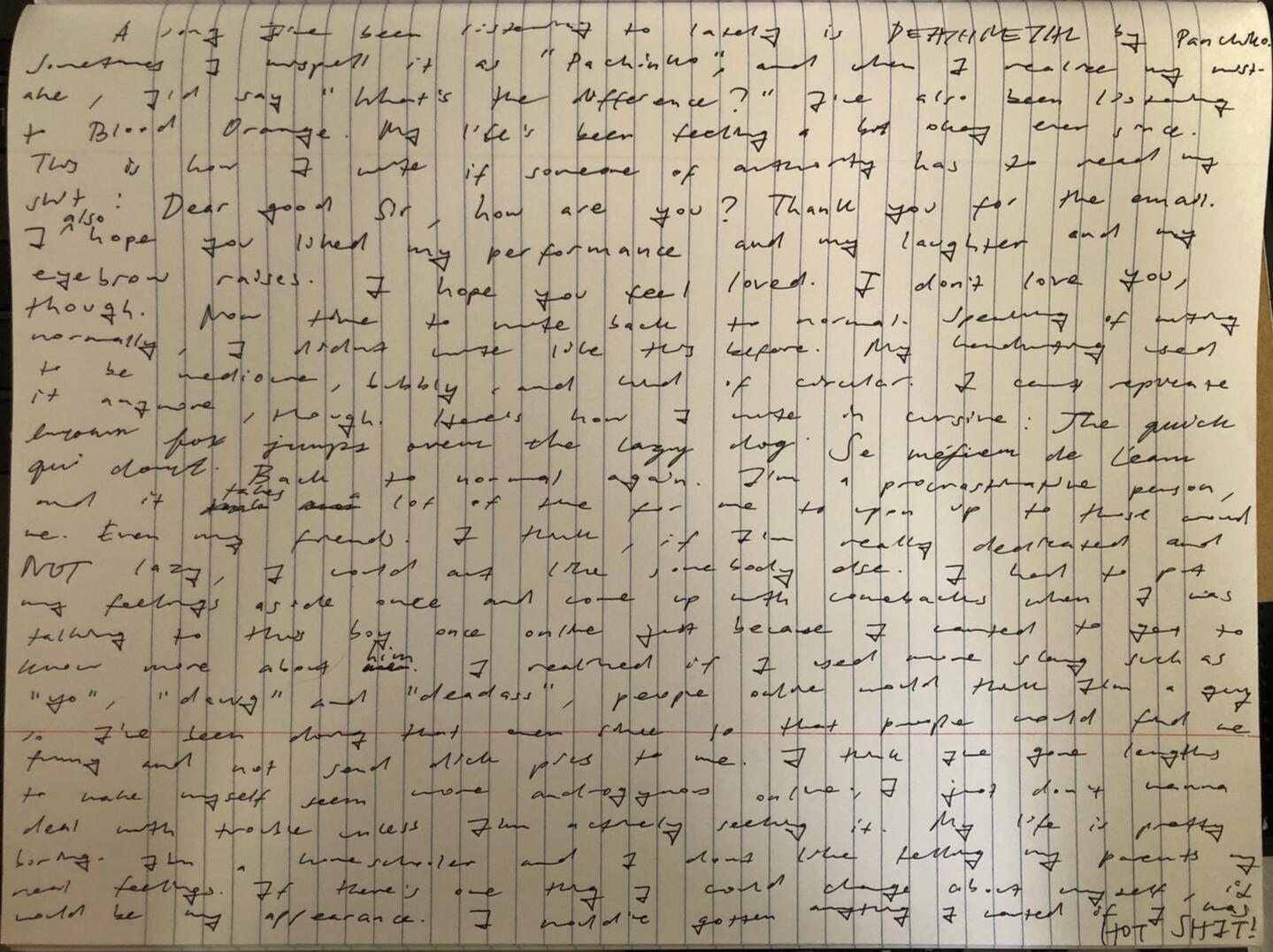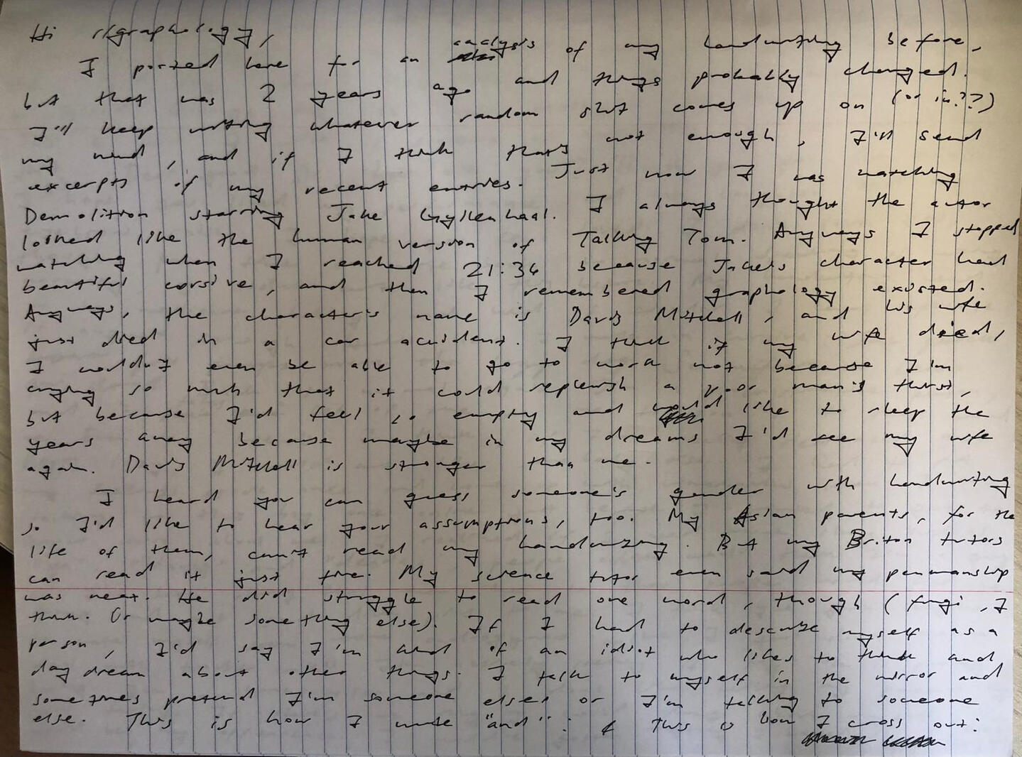 Hi r/graphology,I posted here for an analysis of my handwriting before, but that was 2 years ago and things probably changed. I'll keep writing whatever random shit comes up on (or in??) my mind, and if I think that's not enough, I'll send excerpts of my recent entries. Just now I was watching Demolition starring Jake Gyllenhaal. I always thought the actor looked like the human version of Talking Tom. Anyways, I stopped watching when I reached 21:36 because Jake's character had beautiful cursive, and I remembered graphology existed. Anyways, the character's name is Davis Mitchell, and his wife just died in a car accident. I think if my wife died, I wouldn't even be able to go to work not because I'm crying so much that it could replenish a poor man's thirst, but because I'd feel so empty and would like to sleep the years away because maybe in my dreams I'd see my wife again. Davis Mitchell is stronger than me.I heard you can guess someone's gender with handwriting so I'd like to hear your assumptions, too. My Asian parents, for the life of them, can't read my handwriting. But my Briton tutors can read it just fine. My science tutor even said my penmanship was neat. He did struggle to read one word, though (fungi, I think. Or maybe something else). If I had to describe myself as a person, I'd say I'm kind of an idiot who likes to think and daydream about other things. I talk to myself in the mirror and sometimes pretend I'm someone else, or I'm talking to someone else. This is how I write "and": & This is how I cross out: